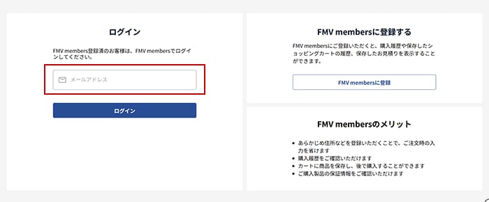 1.FMV members ID(メールアドレス)を入力のうえ【ログイン】をクリック。