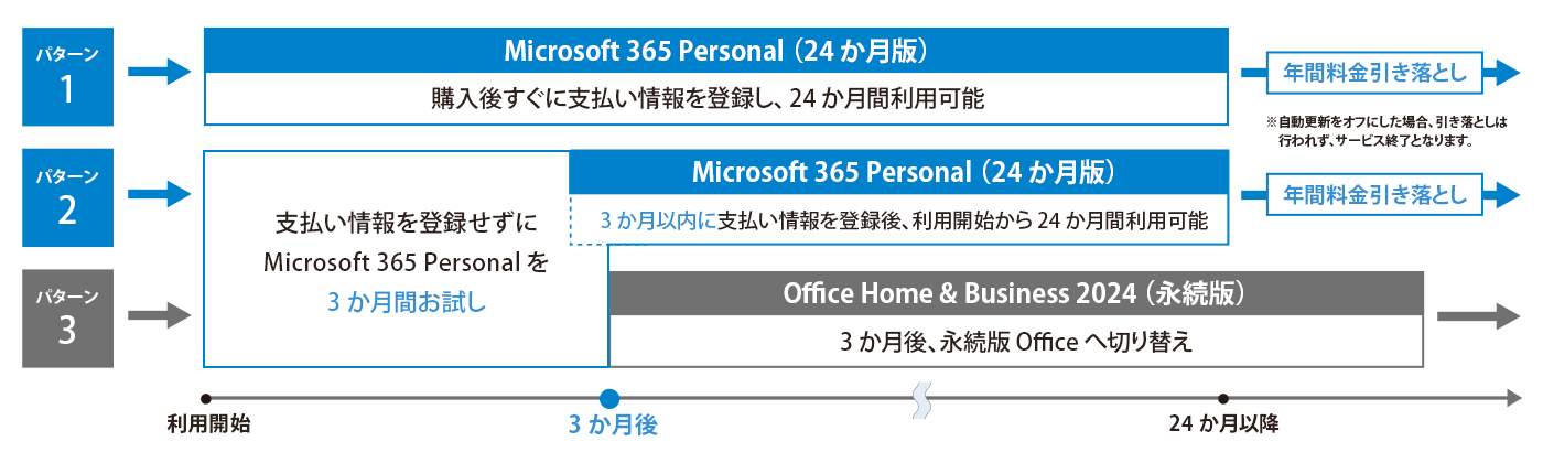 ※ 3か月の体験期間中にお支払い情報を登録しなければ、追加費用なしで永続版の「Office Home & Business 2024」に切り替わります。その場合、Access、Publisherはご使用いただけなくなります。