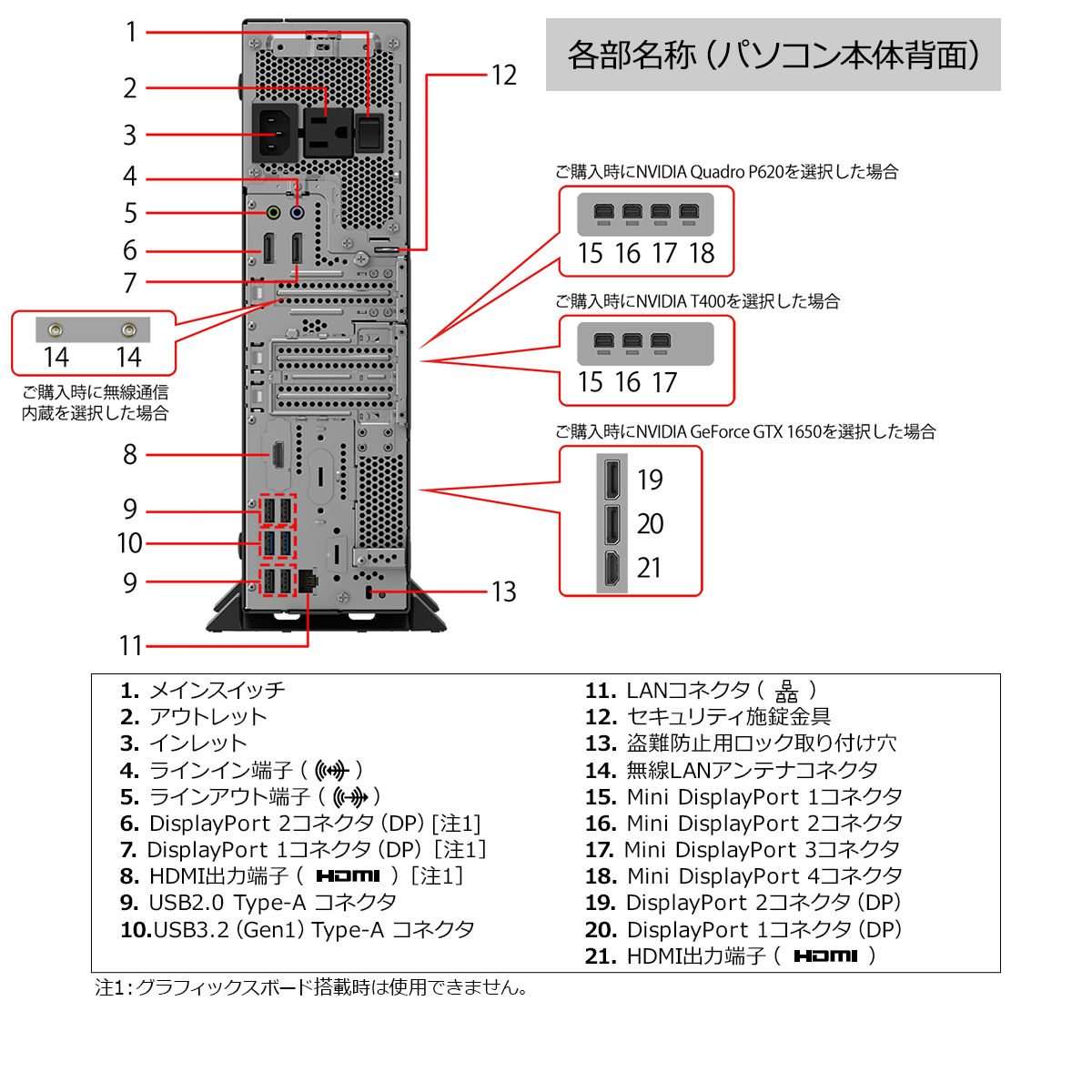 「NVIDIA Quadro P620」「NVIDIA T400」選択時、デュアルディスプレイの接続には別途『MiniDP->DP変換ケーブル(型番:CLE-ADP31)『が必要です。
