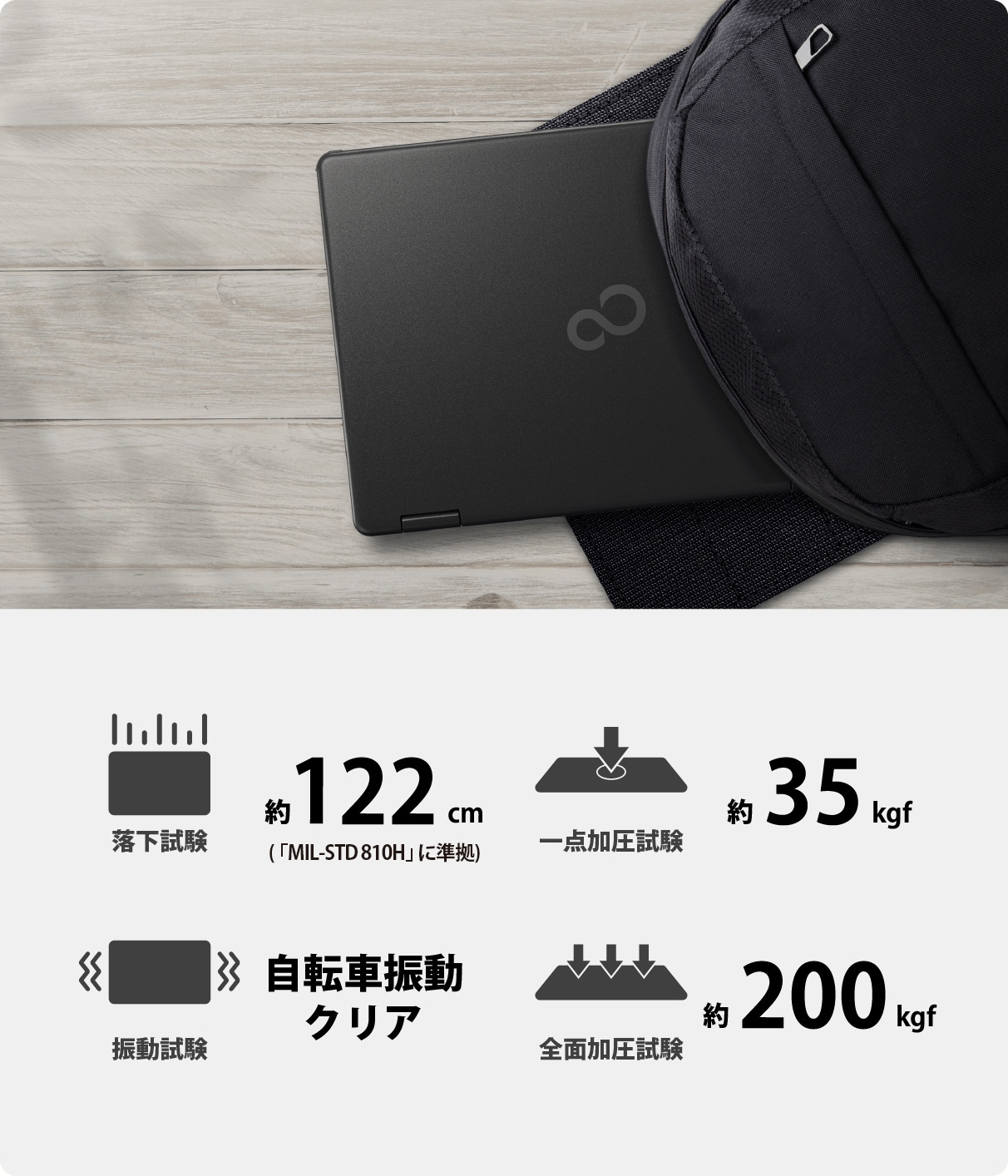 満員電車などでの圧迫を想定した堅牢性試験、360度の開閉など、厳しい独自の品質評価試験に加え、MIL規格「MIL-STD 810H」に準拠した厳しい堅牢性試験をクリアしているので、安心して持ち運ぶことができます(注2)