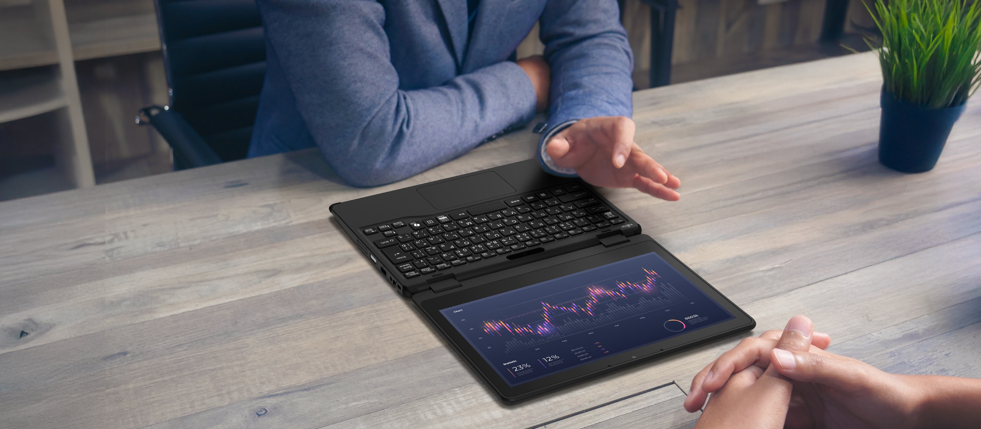 通常のノートパソコンとしてはもちろん、ペンやタッチでの入力はタブレットスタイル、資料を参照するときは省スペースなテントスタイルなど、常に最適なスタイルで利用できます。