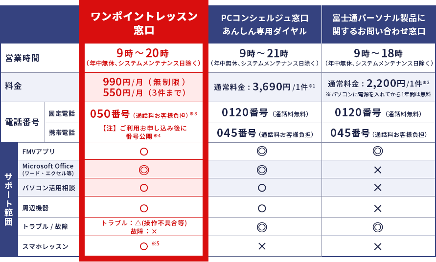 ※当社が運営しております「富士通パーソナル製品に関するお問い合わせ窓口」「PCコンシェルジュサービス」とはサービス内容が異なります。ご了承ください。 - Q5.