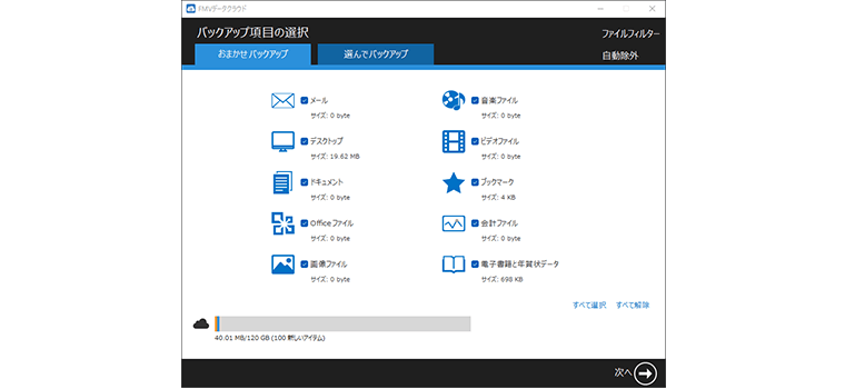 保存可能なファイル…画像ファイル、音楽、ビデオ、デスクトップ、財務ファイル、メール、Officeファイル、マイドキュメント、ブックマーク、電子書籍