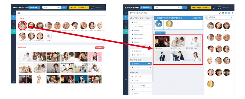 保存データから顔を自動認識して同一人物の画像を一覧表示する「顔認識」、バックアップ時に画像にタグ付けを行う「自動タグ付け」機能など、AIでデータ管理や検索がスムーズに行えます。