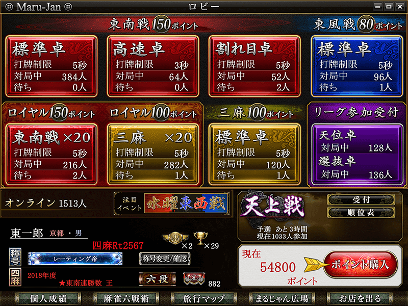 - ※通常卓では1位の人は無料でゲーム続行できます。(続行しない場合は、場代ポイントは返還されます)