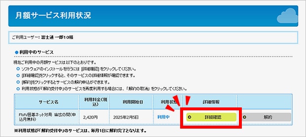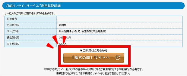 利用中のサービスの「幽玄の間」の「詳細確認」 ボタンをクリック
