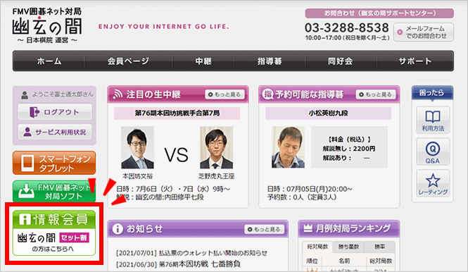日本棋院IDお申し込み・ご利用に関して料金の決済についてコース変更、休会、解約に関して「幽玄の間」の使い方、接続方法等FMV members ID 等に関して
